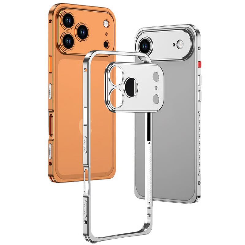 CaseSun-Luxury orange-gold iPhone 17 Pro Max metal bumper case, ultra-thin aluminum alloy frame with cooling design.